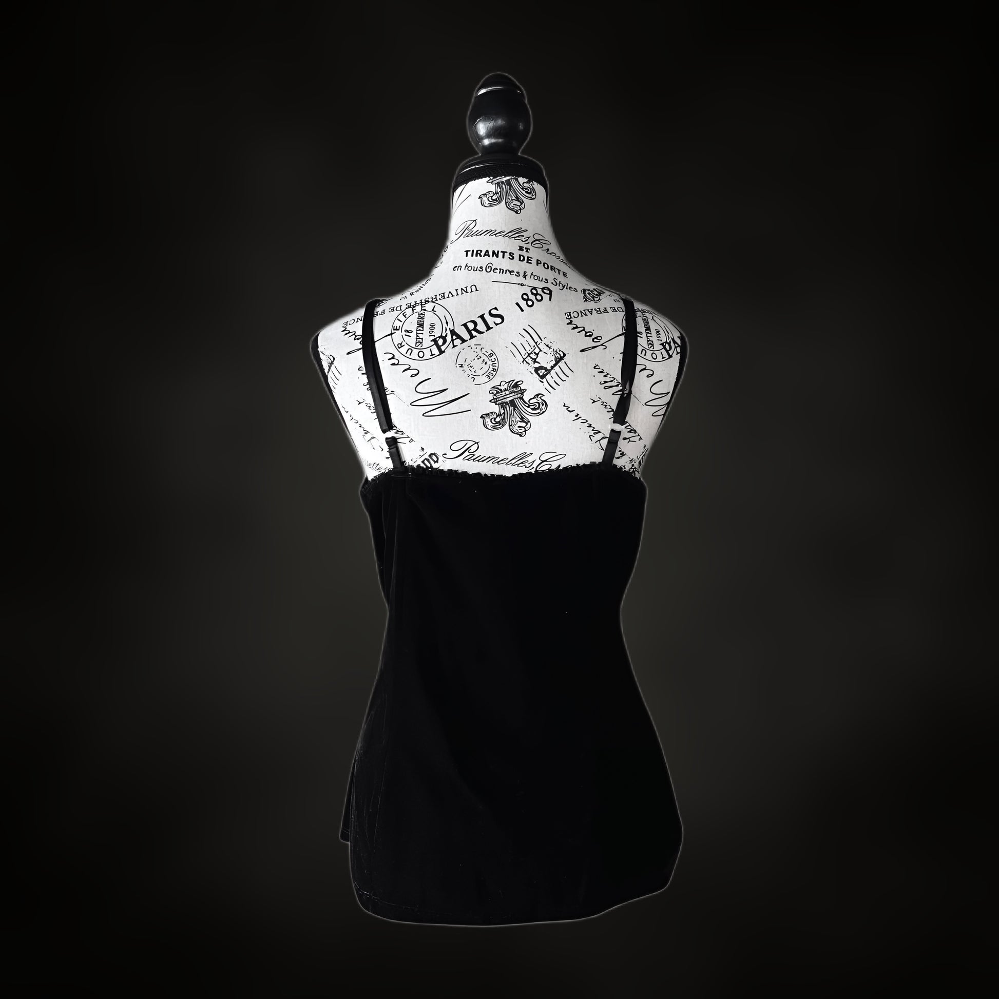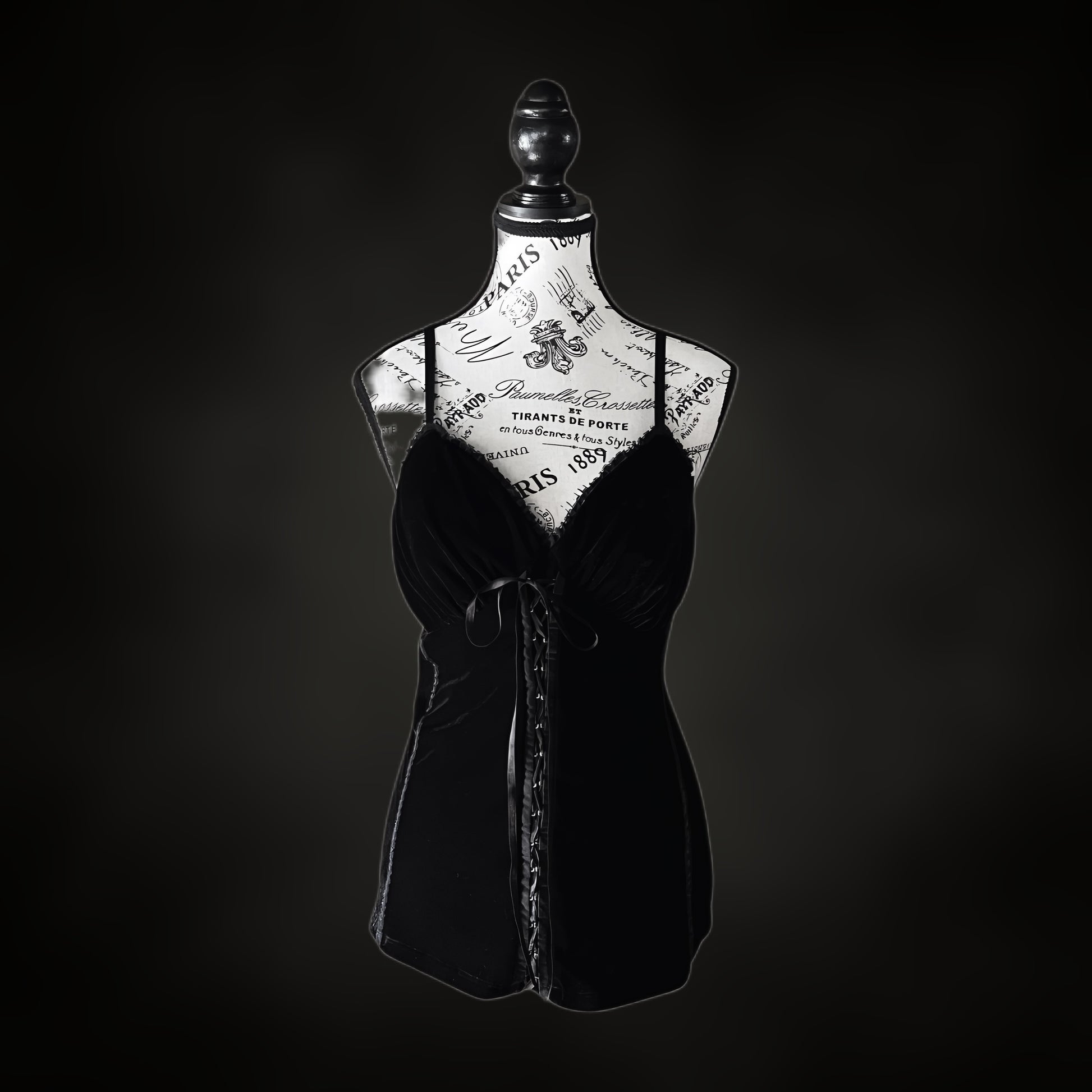Sultry black velvet camisole with a lace-trimmed bust, satin ribbon tie at the front, and corset-inspired vertical detailing. Fitted silhouette with adjustable straps, balancing lingerie allure and 2000s goth glam. Works as a standalone statement or layered under a sheer blouse for extra drama.