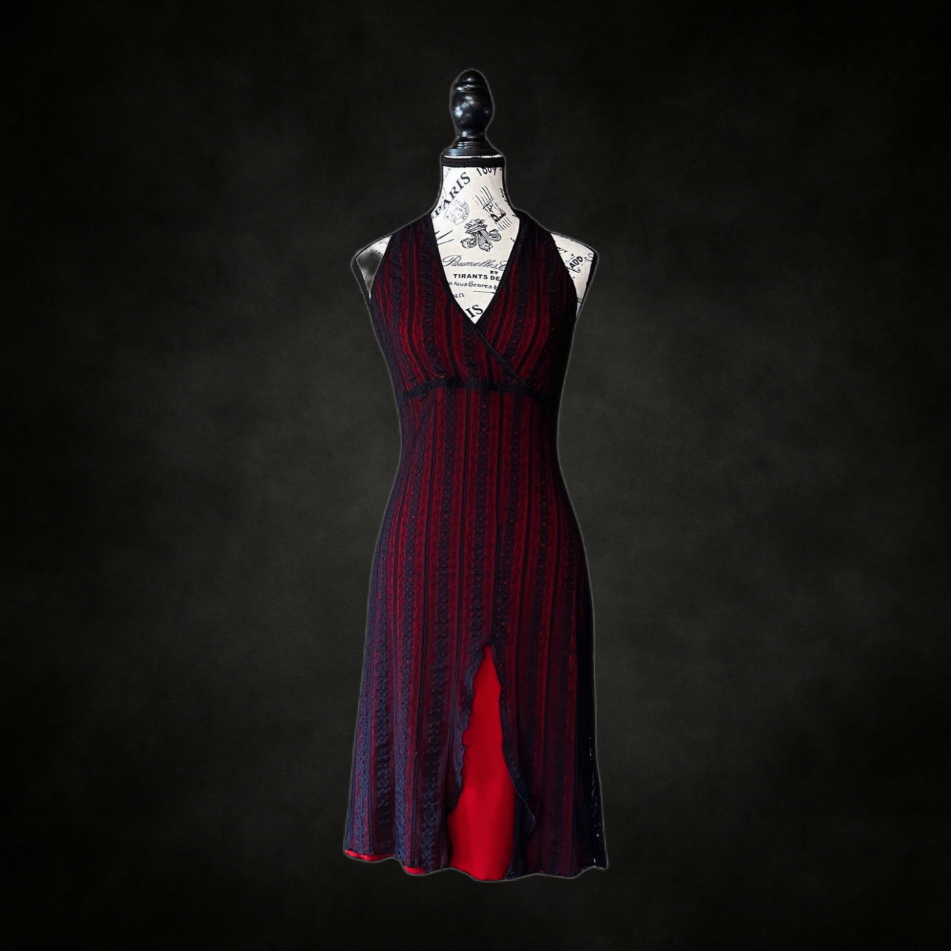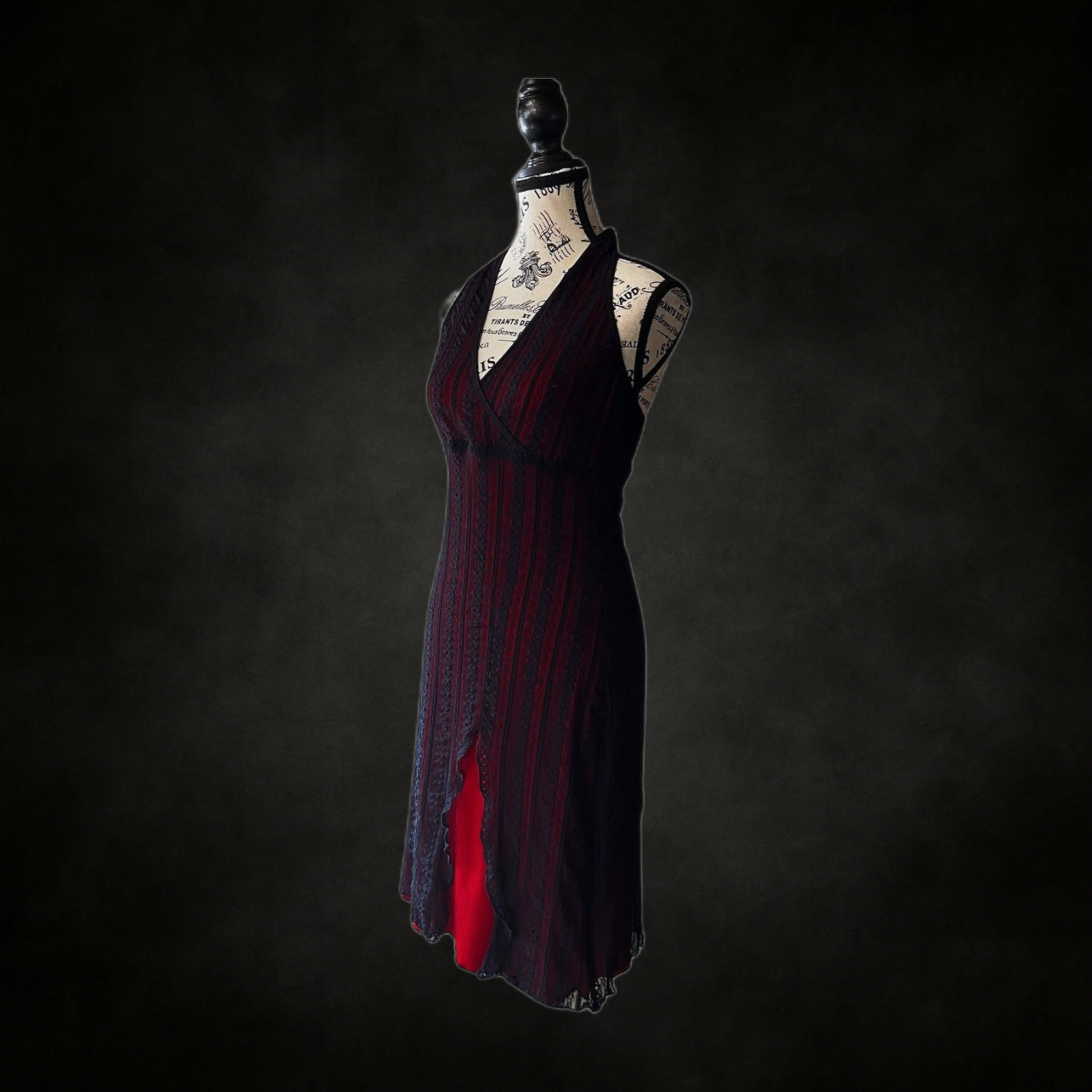 Black lace over deep crimson with a plunging halter neckline, fitted bodice and a front slit. A vampy 90s/00s silhouette that reads nightclub siren / Velvet Dusk ready—layer it with velvet or leather for maximal drama.