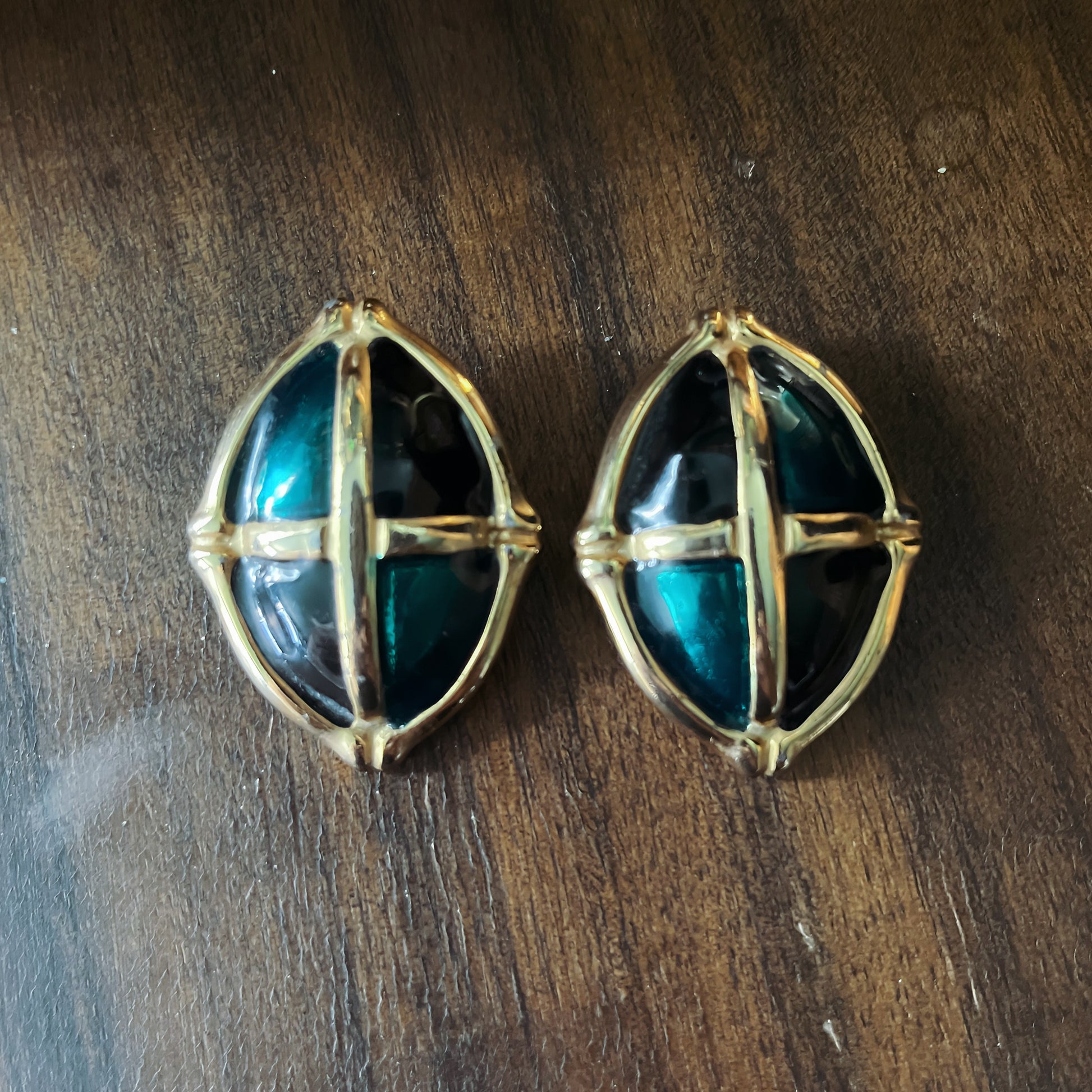 Bold vintage clip-on earrings from the late 1980s, featuring deep emerald and black enamel encased in ornate golden lattice frames.