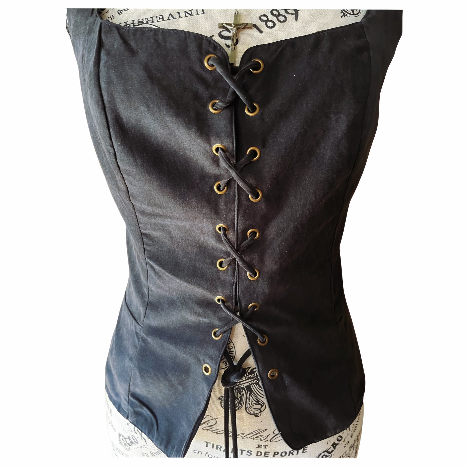 Structured corset-style top in black with brass eyelets and front lace-up closure. Inspired by medieval silhouettes, this piece merges witchy romanticism with a strong dark fantasy edge.