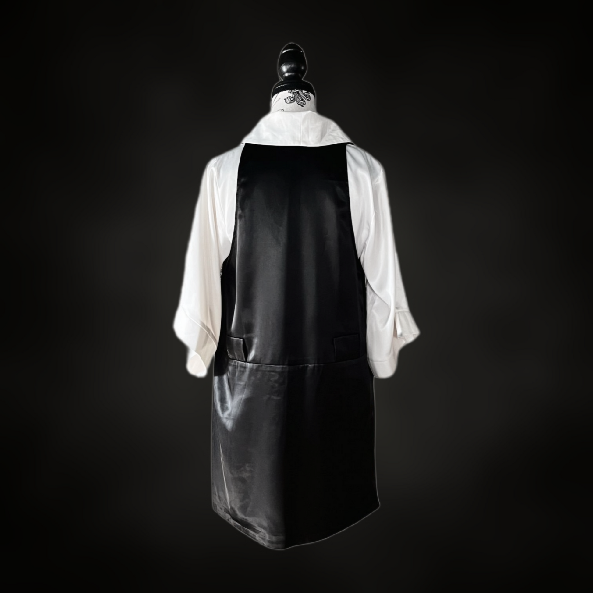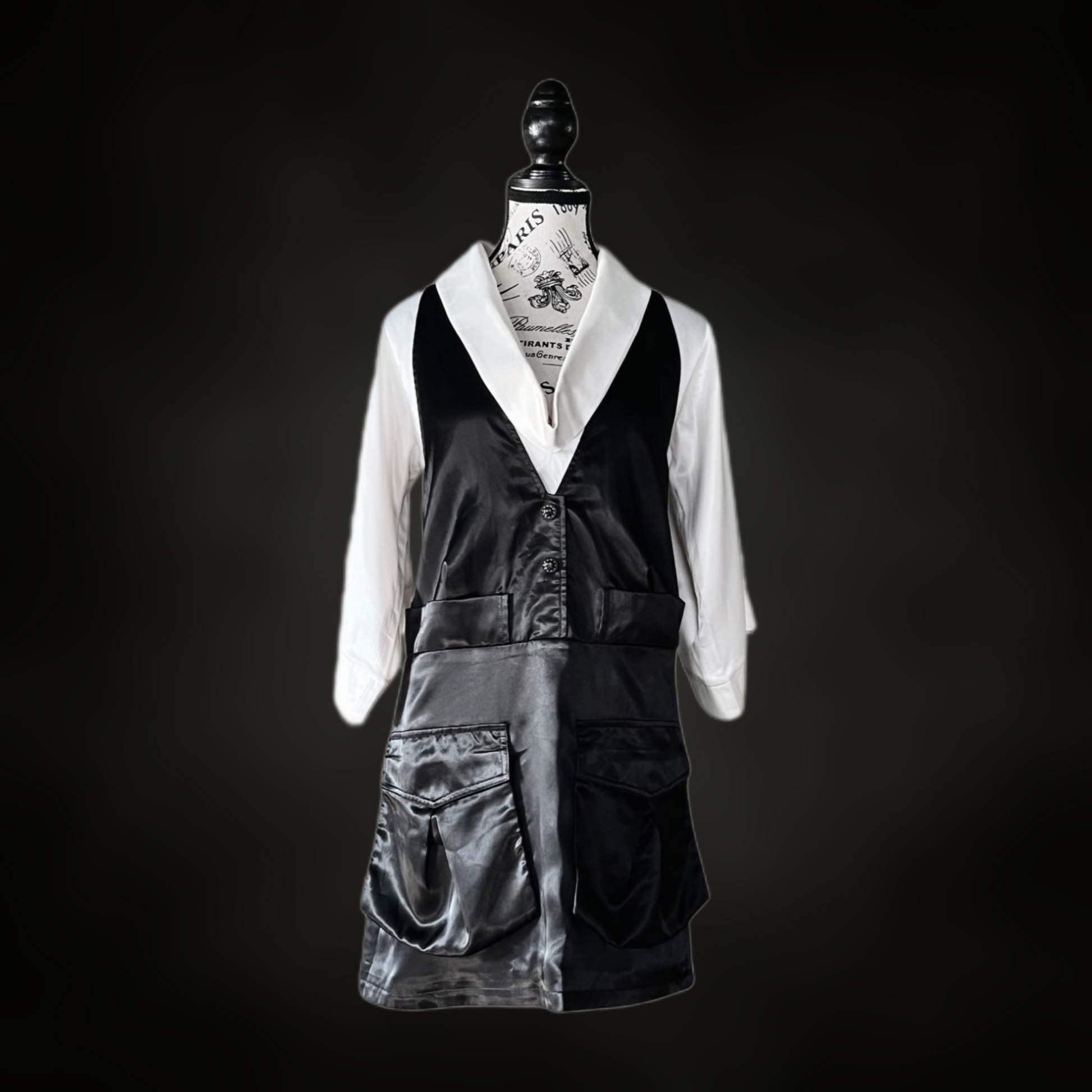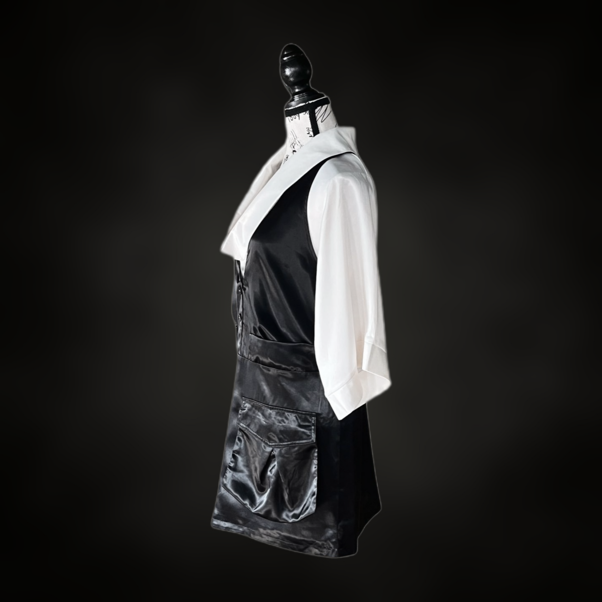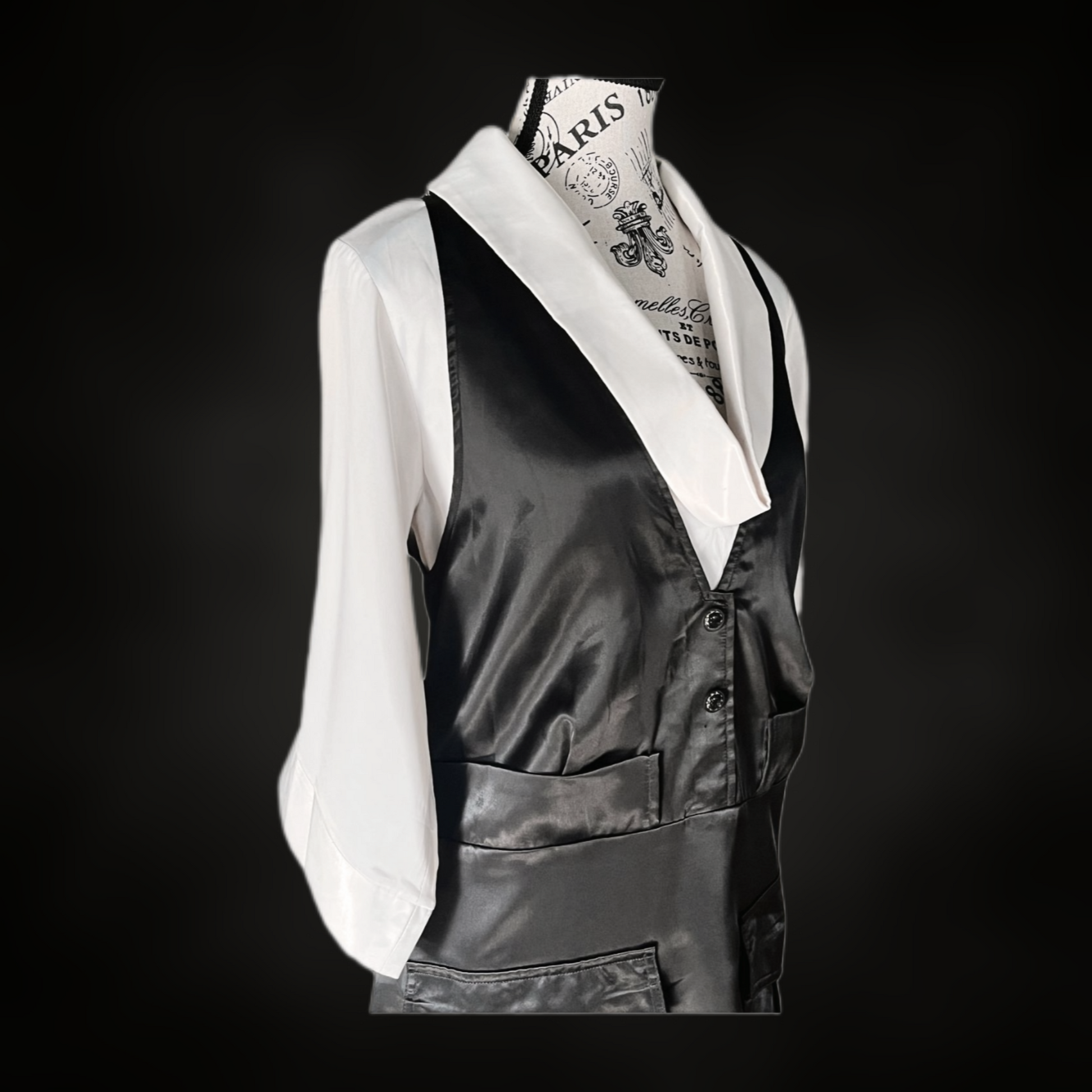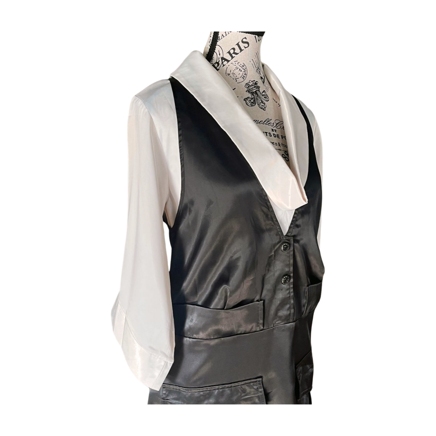An archival Anna Sui design from the 00s, crafted in 100% silk. This layered tunic contrasts a crisp white shirt base with a sleek black silk vest overlay, creating tension between gothic romance and tailored minimalism. With its fluid drape and unmistakable 90s downtown edge, it stands as both a collector’s piece and a wearable statement of underground elegance.