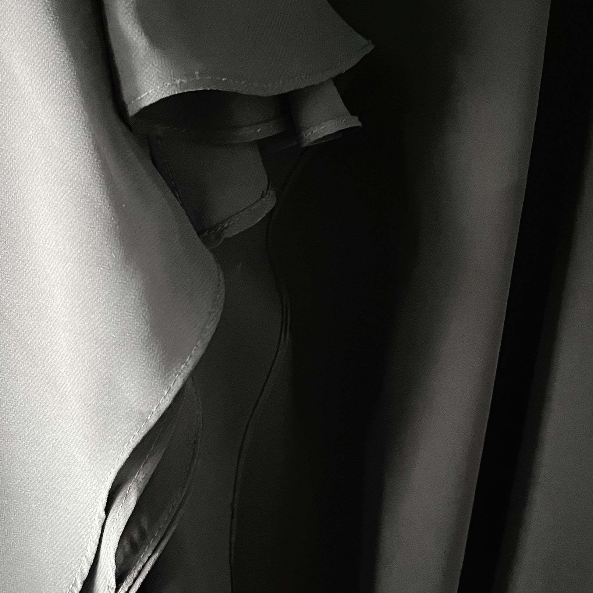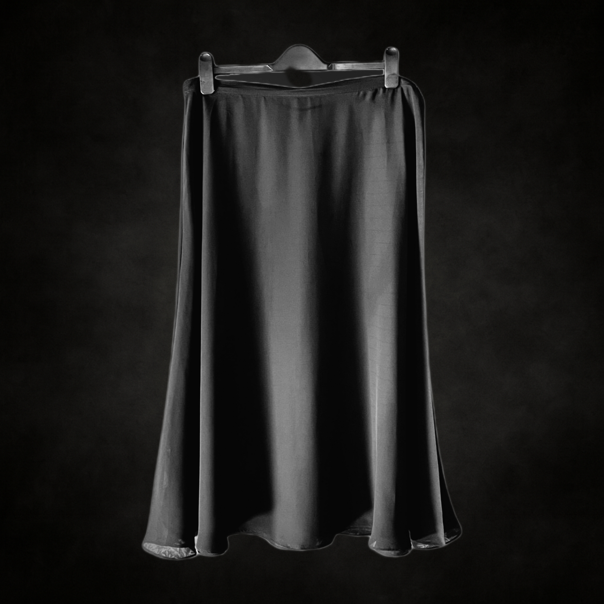 A fluid black midi skirt with a sheer mesh layer drifting over a solid base, creating subtle depth and shadow. Minimal yet evocative, it carries the soft vamp silhouette of the 1990s — ideal with slips, sheer blouses, or oversized knits. A versatile piece for underground styling, shifting easily from day to nocturne.