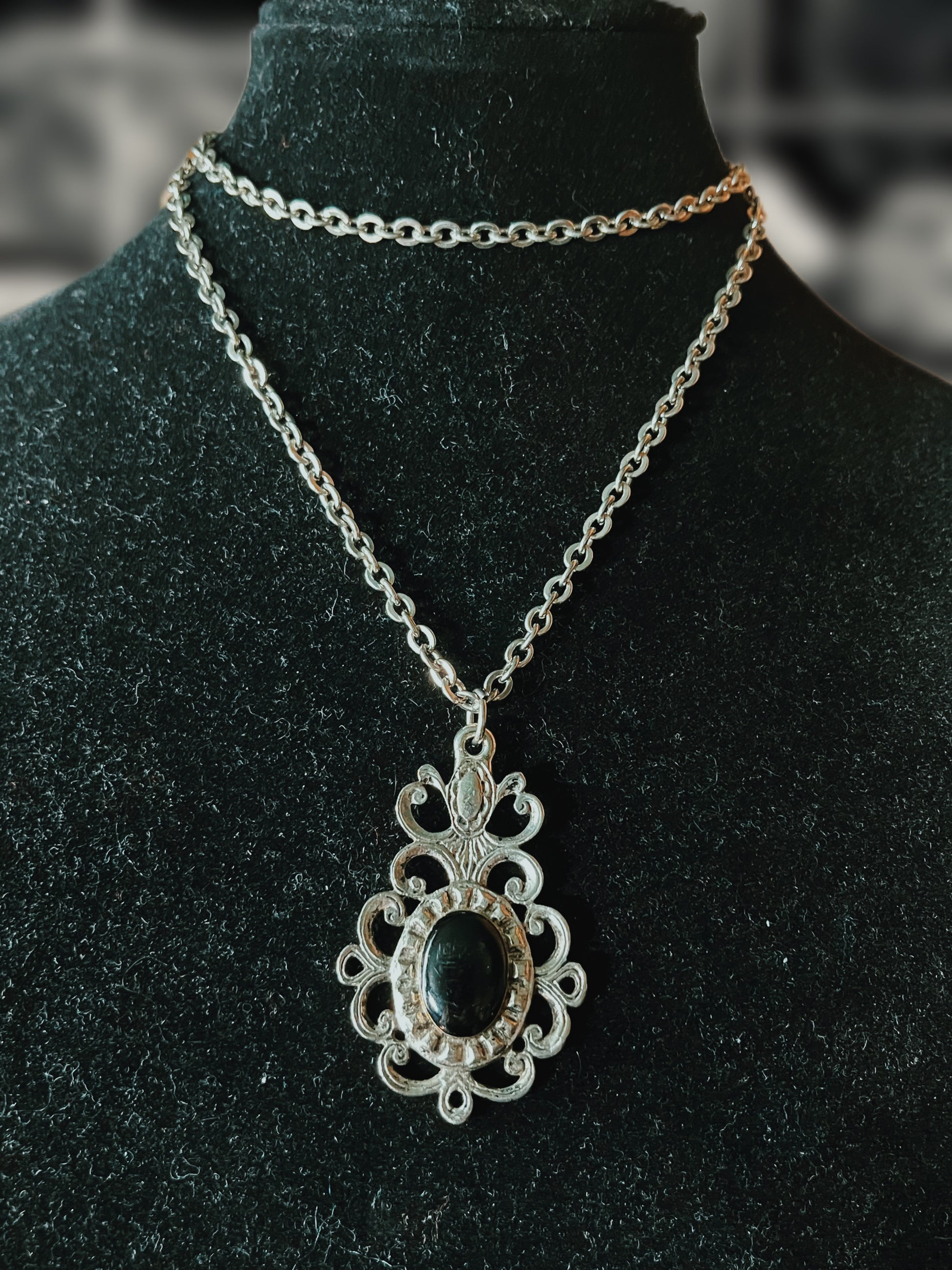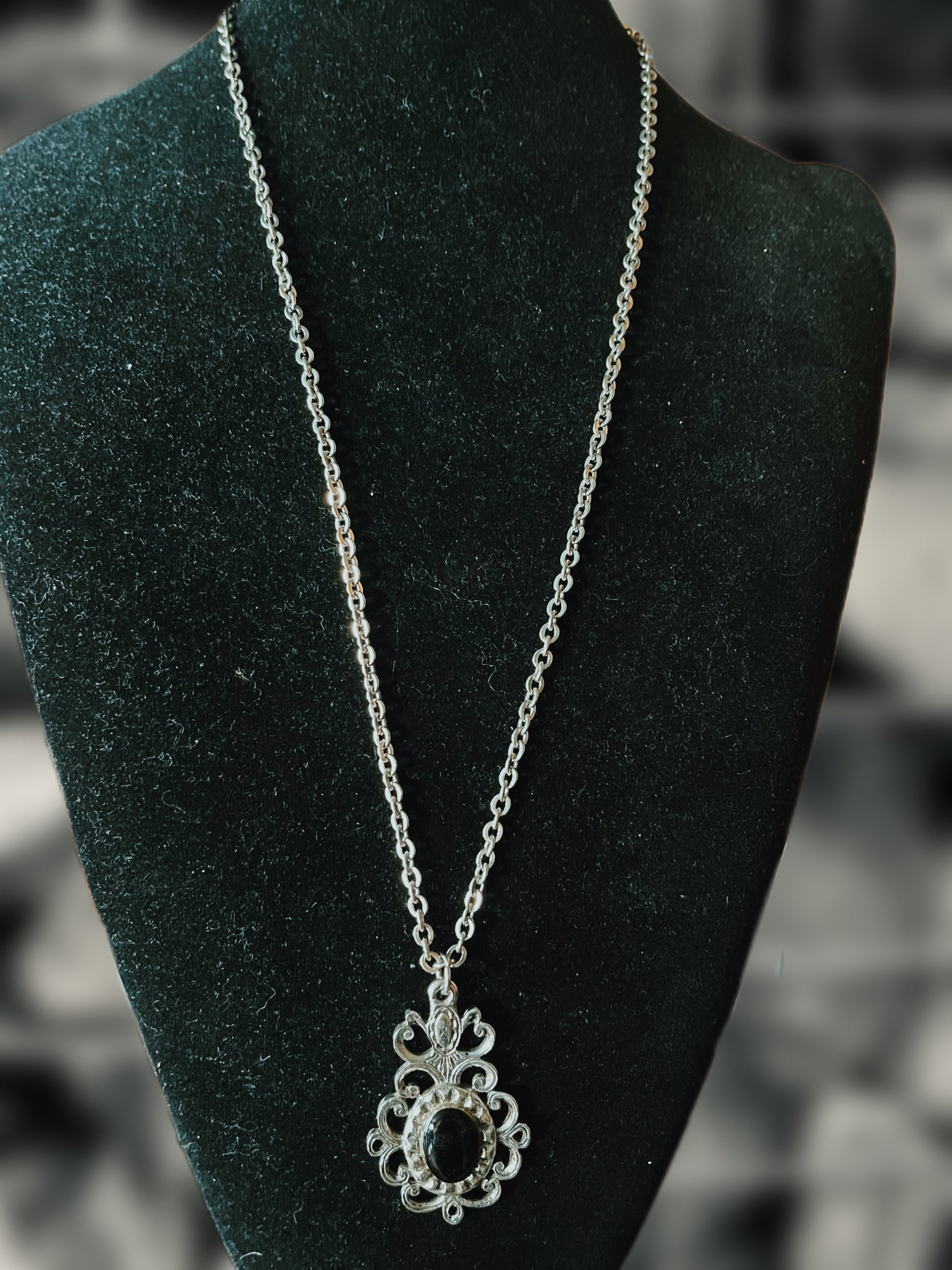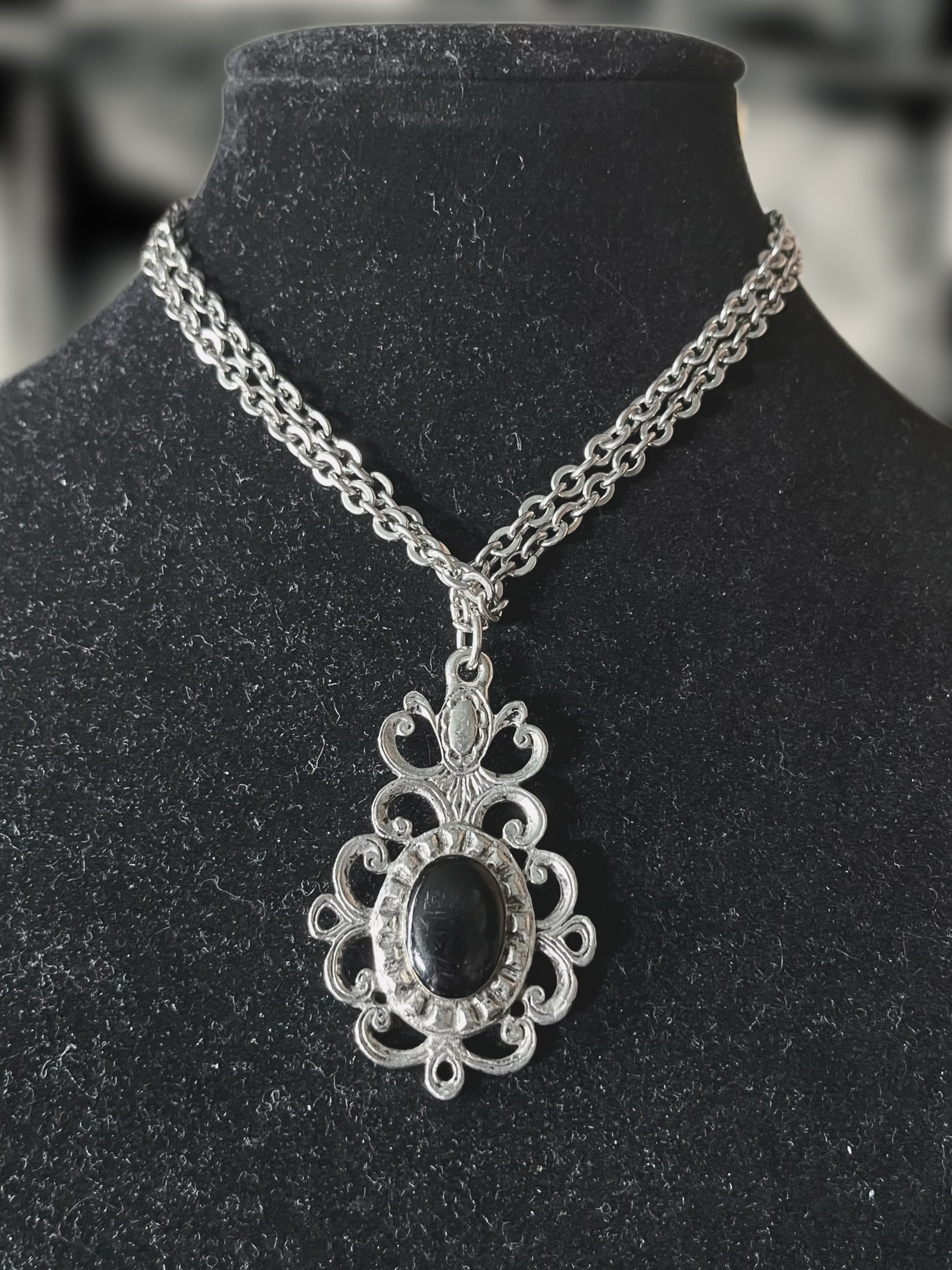 Vintage Ornate Gothic Pendant Necklace – Silver Tone with Black Cabochon