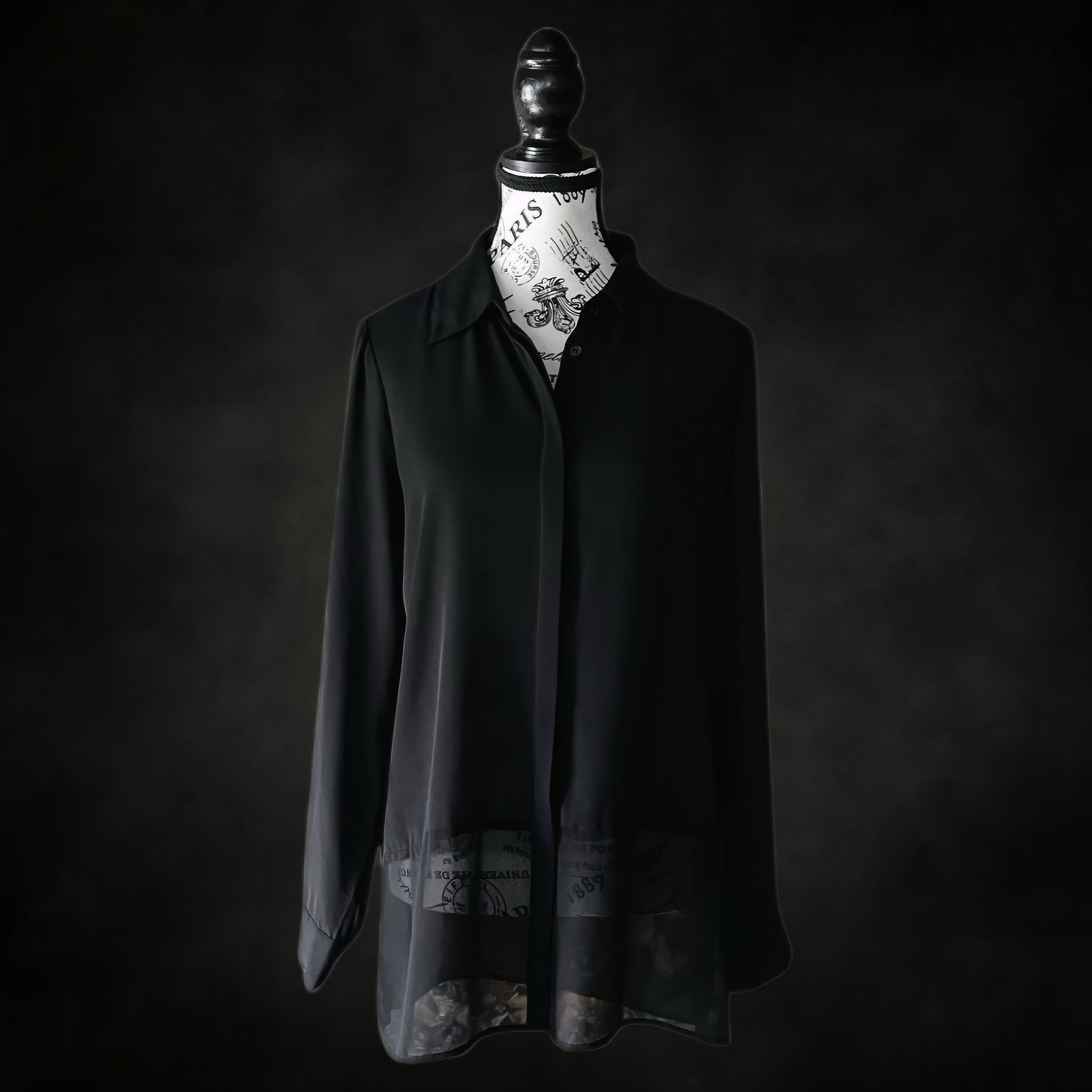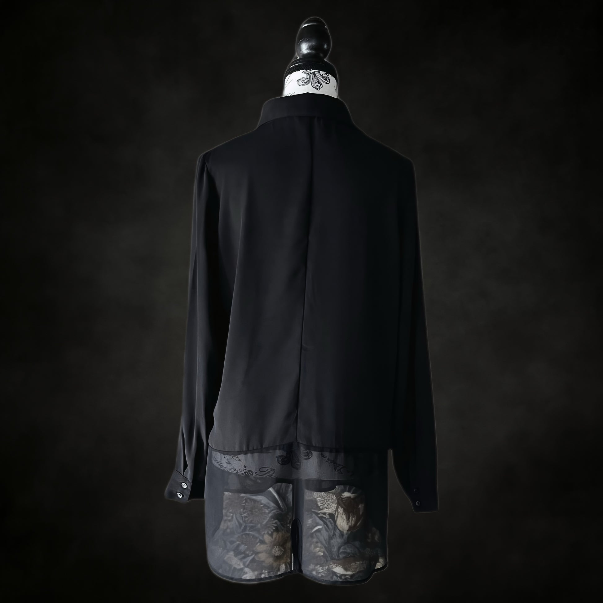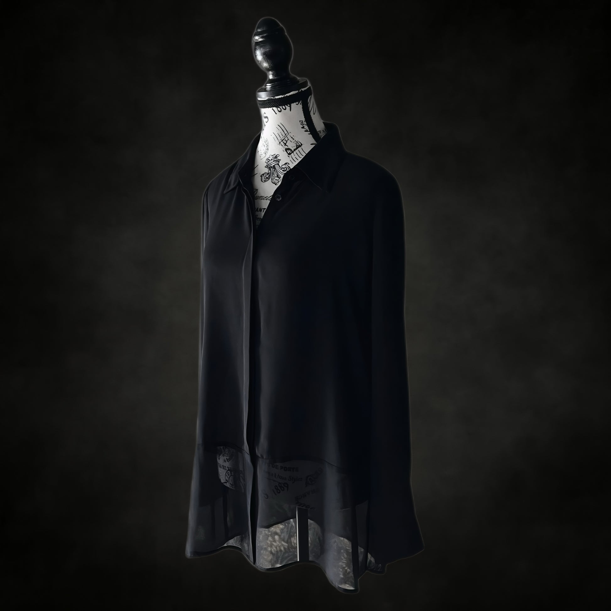 A weightless black layer with a shadowy, fluid drape. The sheer weave softens the lines of tailoring and slips easily over slips, tanks, or lace — from romantic goth to minimal nocturne. Clean collar, elongated silhouette, and a light transparency that invites layering rituals.
