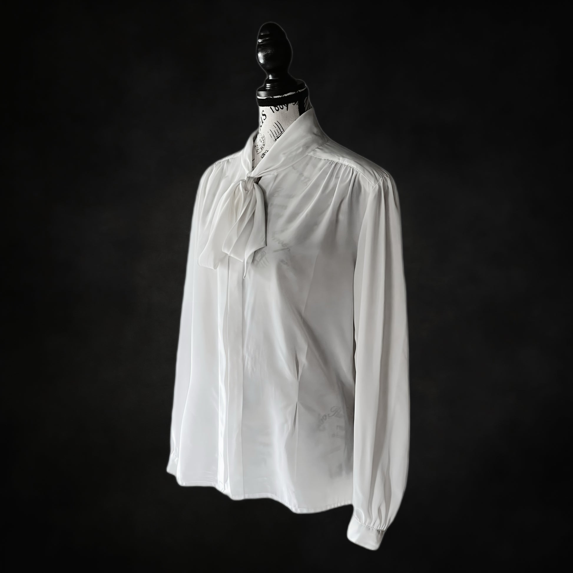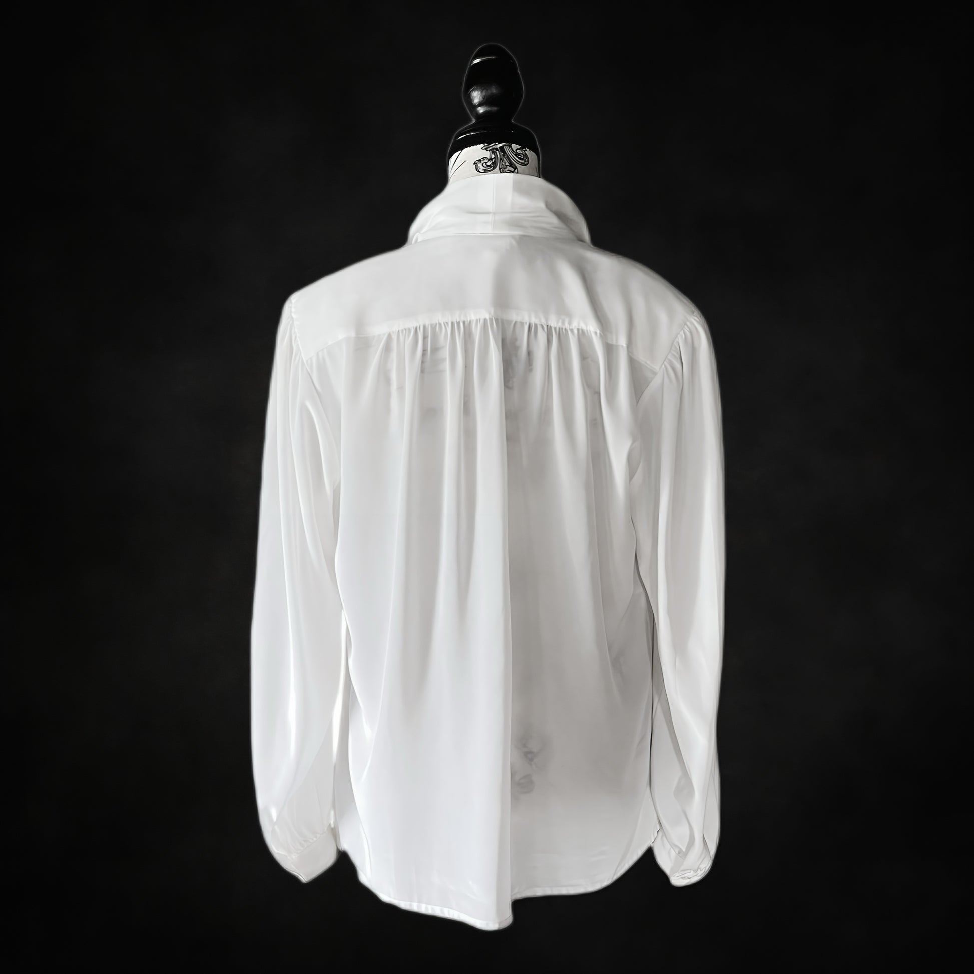 A classic 1980s white blouse with an elegant pussybow tie at the collar. Lightly gathered shoulders and long sleeves add volume and softness, while the fluid drape creates a silhouette that shifts between romantic academia and sharp vintage tailoring. A versatile piece — equally suited for layering under a blazer or styled as a statement with dark trousers.